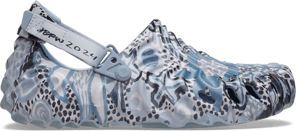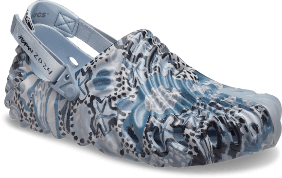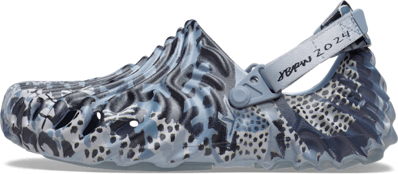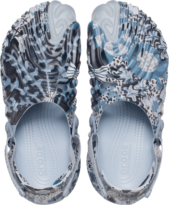 The Crocs Pollex Clog by Salehe Bembury is composed of 3 of his signature fingerprints merged together, with dramatic concave ridges allowing for multi-directional traction. The shoe can be worn two ways with two adjustable and removable heel straps; "Trail" for lifestyle & outdoor use and strapless for "Free" wear.